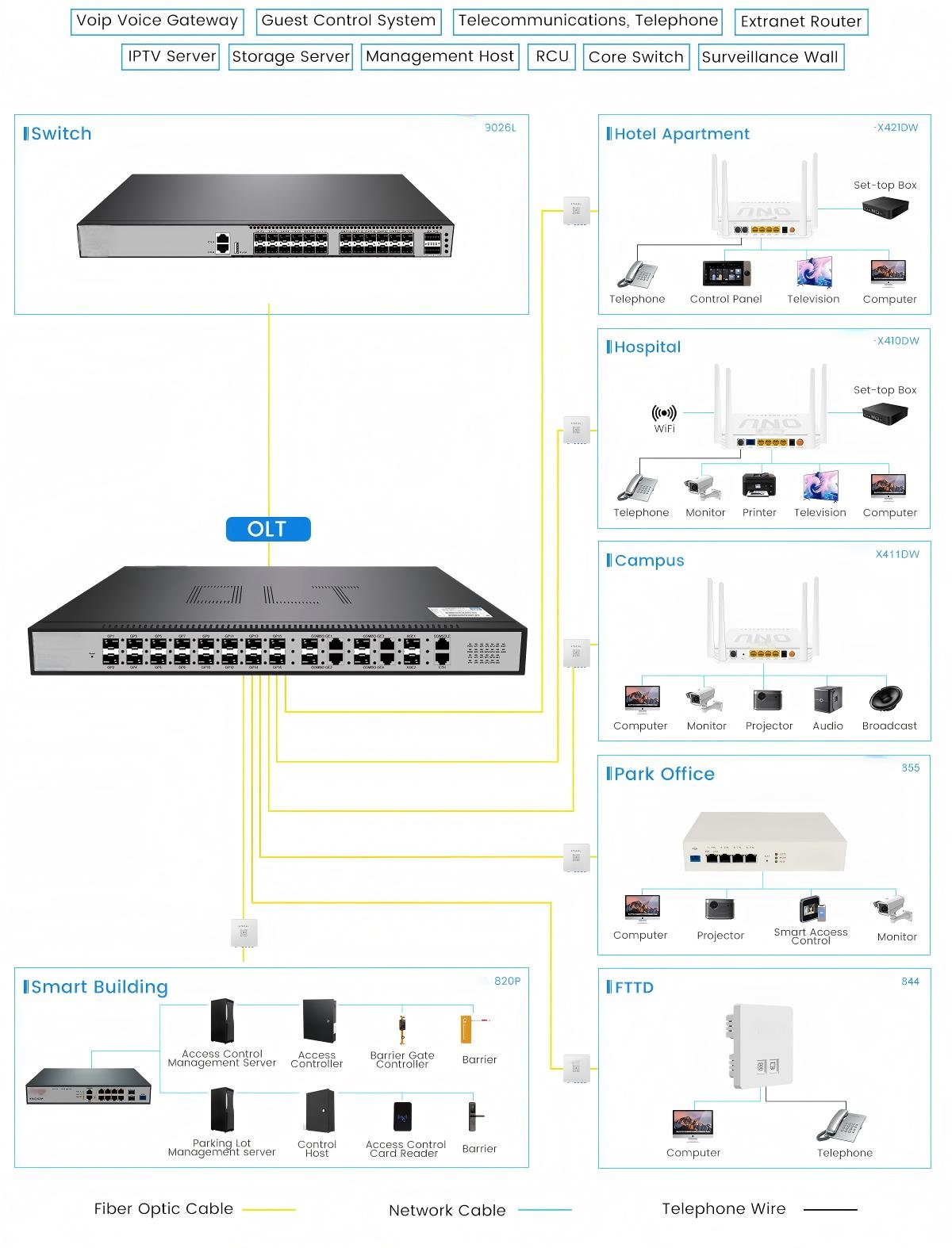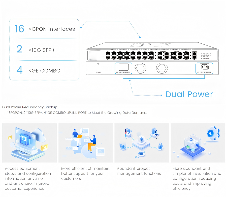 The product provides 16 GPON interfaces, with 4*Combo uplink interfaces or SFP interfaces, 2*uplink SFP+interfaces. Through the cloud management function, users can quickly deploy, configure, remotely manage and operate the all network equipment, which greatly reduces the labor cost and time cost in the process of network construction. It is appropriate for situations like sparsely populated, remote and cost-sensitive areas, smart industrial parks, commercial premises, FTTH, etc. Each GPON port supinterfaces up to splitting ratio 1:128 and 2048 GPON users, also supinterfaces different types of ONU based on different networks. 1U for easy installation and maintenance. It is an excellent choice for ISP deploying FTTH networks quickly.