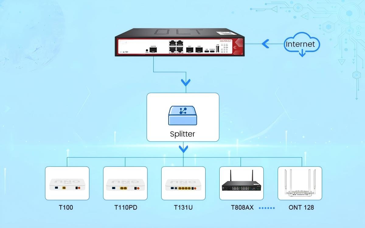 T01 is a box type XGS-PON/XG-PON OLT. The system has good stability and high reliability. Supports multiple management methods such as CLI, WEB, and SNMP. The product provides 1*XGS-PON/XG-PON ports, 4″ GE RJ45, 1*GE type-c uplink ports and 2*10G SFP+ Slots. Users can quickly deploy, configure, and monitor the device via the cloud management, greatly reducing labor and time costs during network construction. Suitable for sparsely populated and budget limited areas, smart industrial parks, commercial buildings, FTTR, etc. Each PON port supports a maximum split ratio of 1:128, supports up to 128 users, 1U height is convenient for installation and maintenance. It is an excellent choice for operators to migrate from GPON to 10G PON.