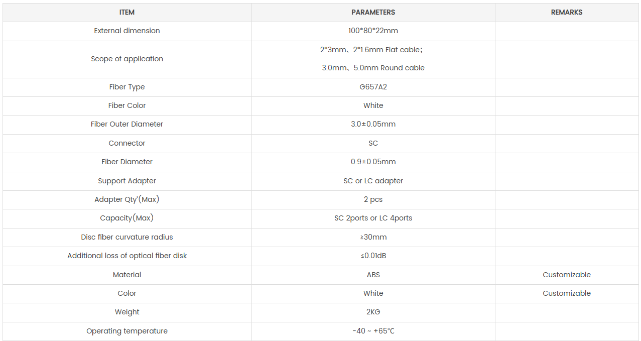 - The wall outlet termination box can be realized with outdoor optical cable fixing, leather line optical cable fixing, adapter fixing, and fast field connector fixing. The pull-off force is greater than 50N, fixed, and reliable.
