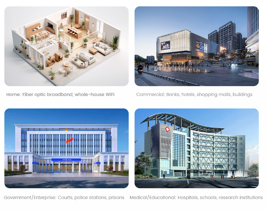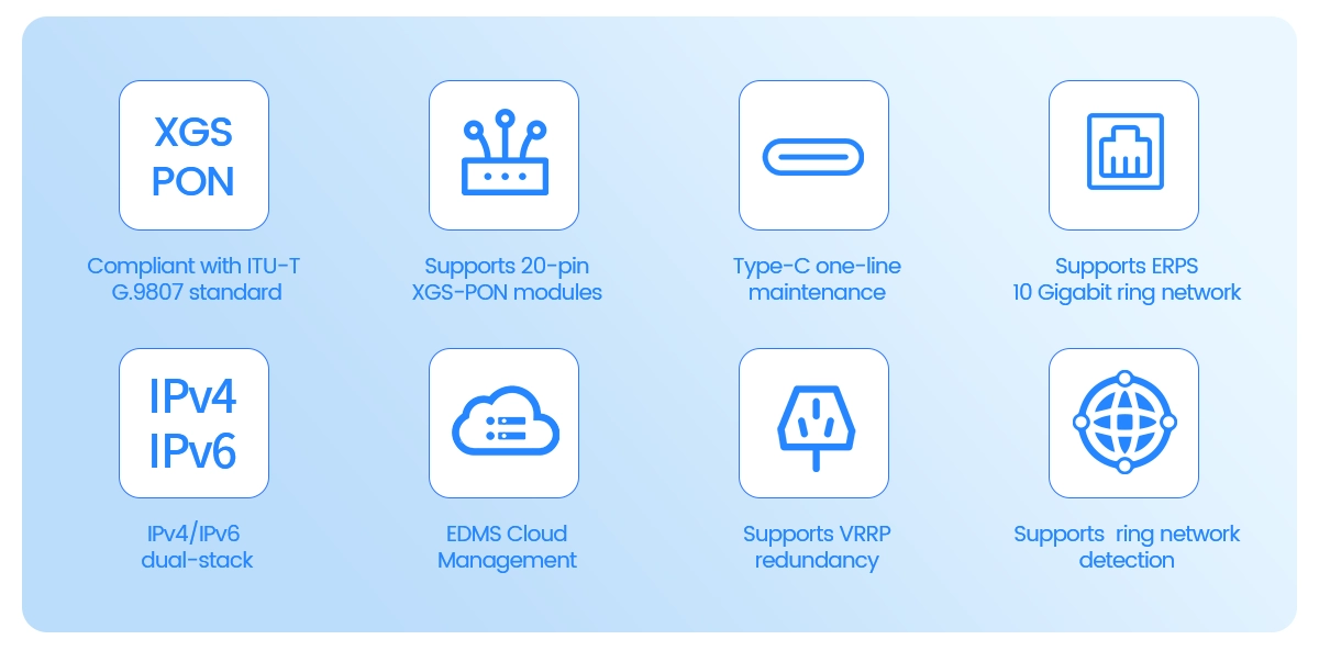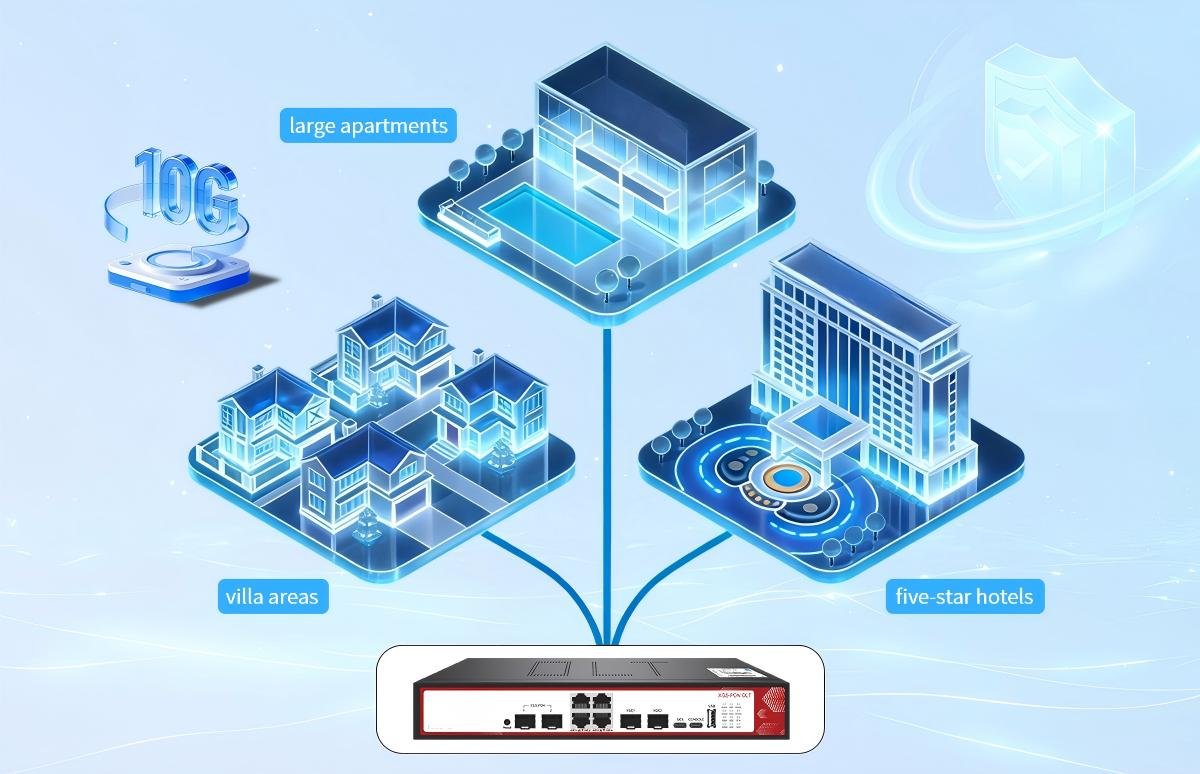10G symmetrical speed, PON Type B protection, high reliability, high bandwidth, suitable for scenarios with low access density but high speed requirements, such as villa areas, large apartments, five-star hotels, etc.