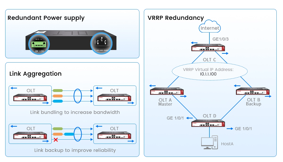 Redundancy Protection: Supports hardware and software redundancy design, including redundant power supplies, redundant link protection, and VRRP redundancy to ensure uninterrupted service.