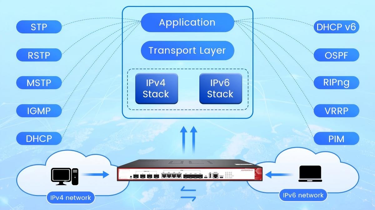 Support STP/RSTP/MSTP/IGMP/DHCP/DHCP v6/LLDP/Static Route/OSPF/RIP/VRRP/PIM, etc.