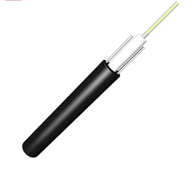 The fibers, 250μm, are positioned in a loose tube made of a high-modulus plastic. The tubes are filled with a water-resistant filling compound. Over the tube, water-blocking material is applied to keep the cable watertight. Two parallel steel wires are placed at the two sides. The cable is completed with a polyethylene (PE) sheath.