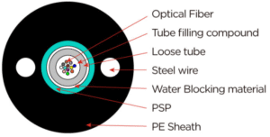 In the GYXTW cable, single-mode/multimode fibers are positioned in the loose tube, which is made of high-modulus plastic materials and filled with filling compounds. PSP is longitudinally applied around the loose tube, and water-blocking materials are distributed into interstices between them to guarantee compactness and longitudinal water-blocking performance. Two parallel steel wires are placed at both sides of the cable core while the PE sheath is extruded over it..