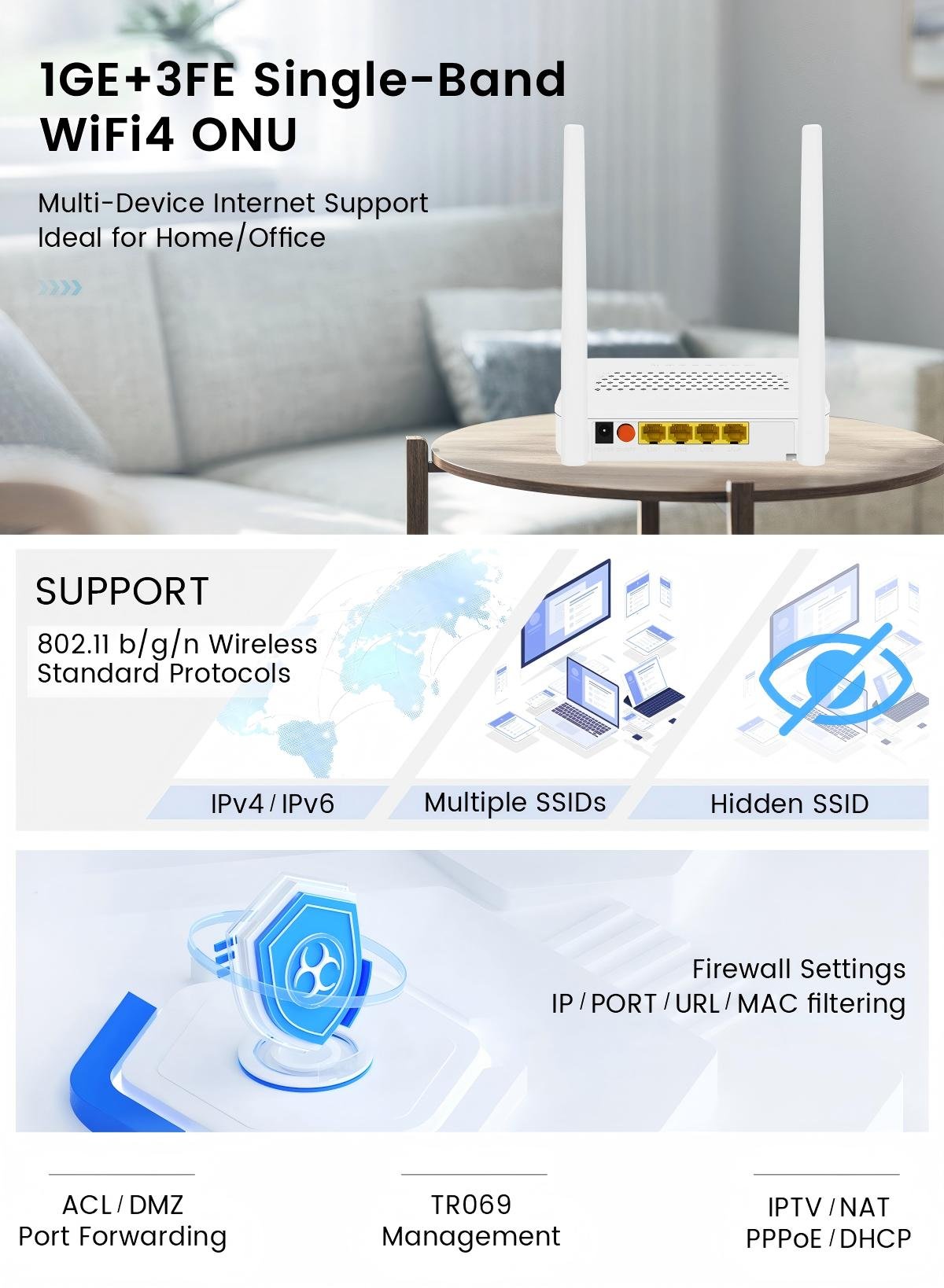 Value: Compared with purchasing optical modems and wireless routers separately, WiFi 4 ONU has a better cost-effectiveness.