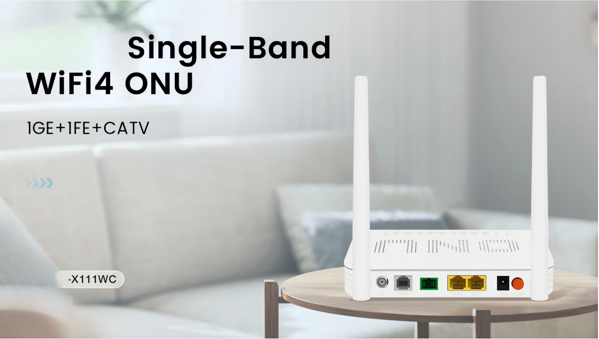 X111WC is a network device that integrates multiple functions, mainly used for broadband access of fiber to the home (FTTH). It integrates 1 Gigabit Ethernet interface (1GE), 1 Fast Ethernet interface (1FE), CATV interface and wireless function supporting WiFi 4, which can meet the broadband access and multimedia transmission needs in various application scenarios such as home, office, hotel, school campus, etc.