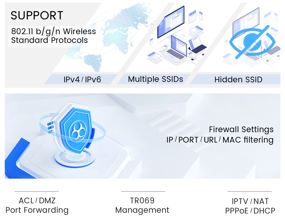 Supports the WiFi 4 standard, providing stable and high-speed wireless network connections. In addition, the ONT may also be equipped with a high-gain antenna (such as 2×5dBi) to further enhance the wall penetration and coverage of wireless signals, ensuring that users can enjoy a smooth wireless network experience in any corner of their home.