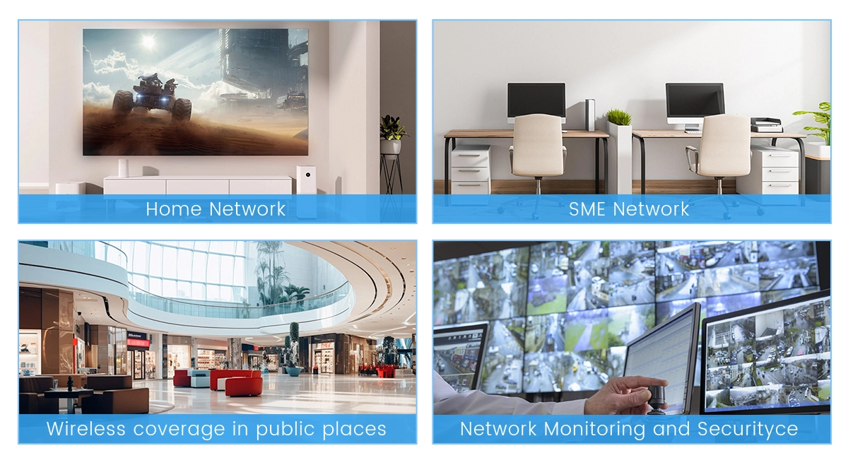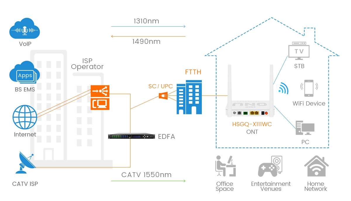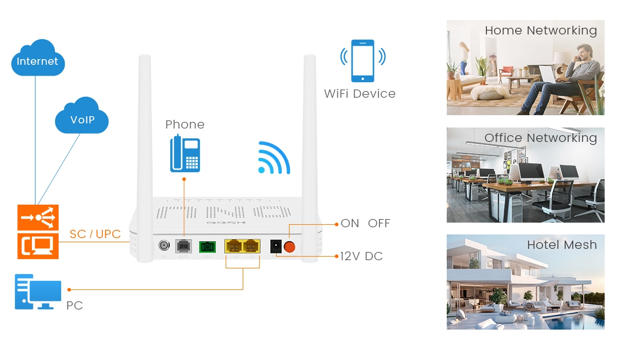 Integrates Internet access, TV and WIFI functions in one, and is suitable for a variety of application scenarios such as home, office, hotel, enterprise, school campus, etc., meeting users’ network access needs in different scenarios.