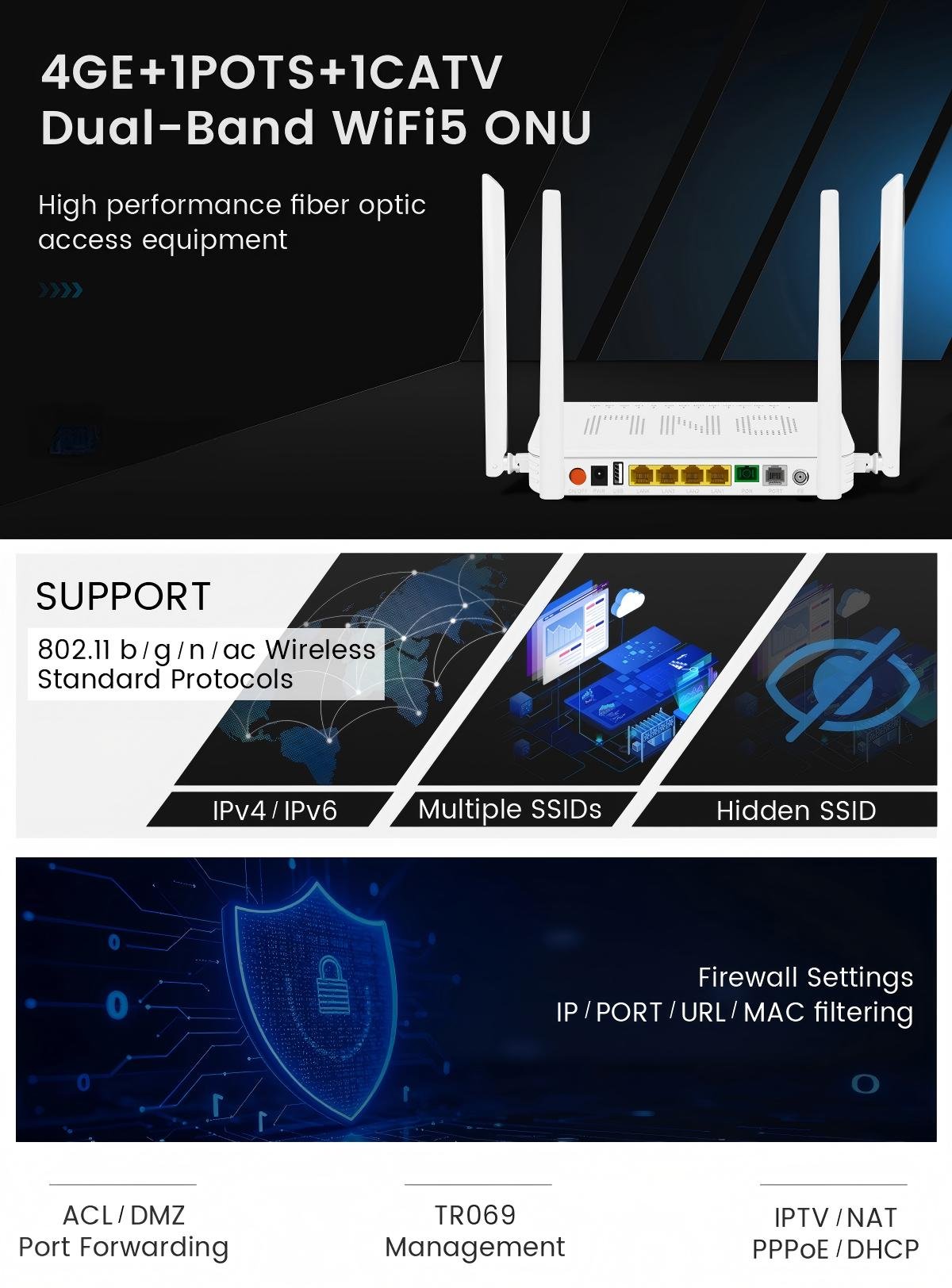 X411DWC is a full-featured network device for home or small office use. It not only supports fiber-optic broadband access, but also traditional telephone services and cable TV. It also provides dual-band Wi-Fi and multiple Gigabit wired interfaces, making it suitable for users who need multiple services and high-speed network connections.