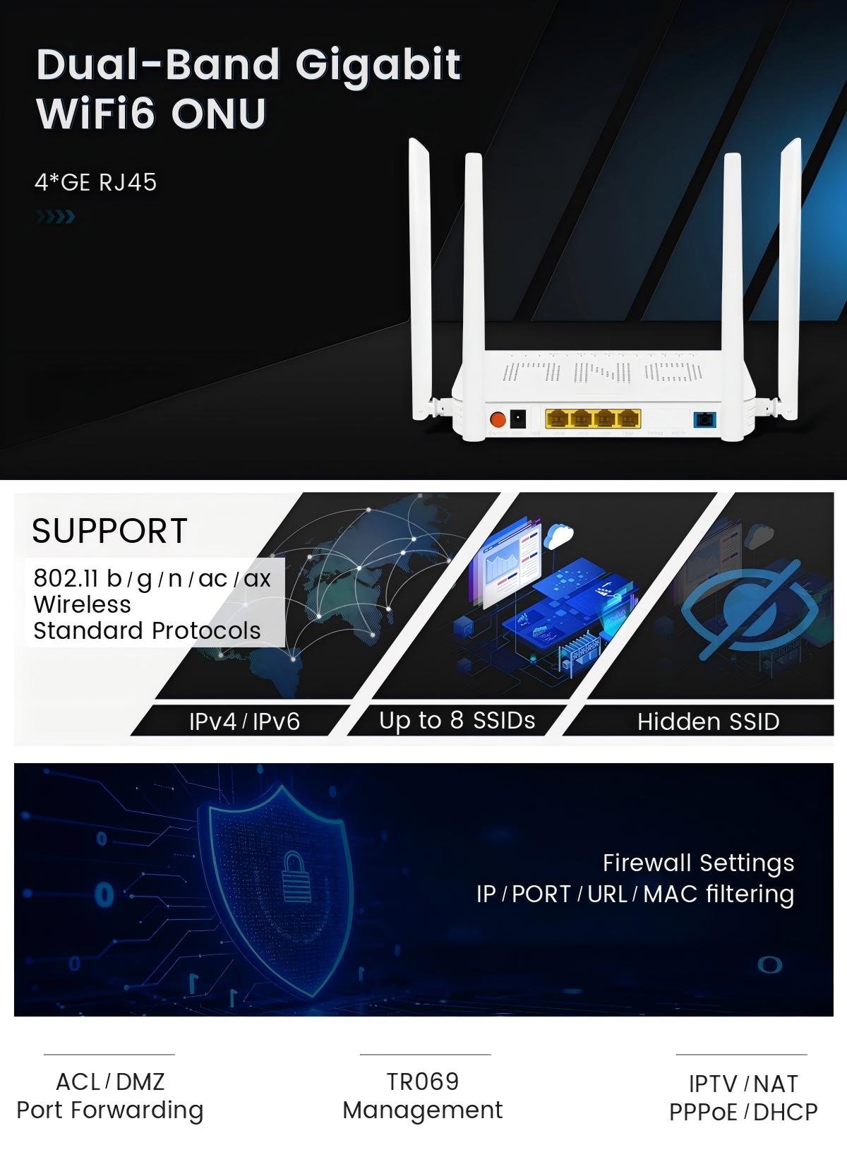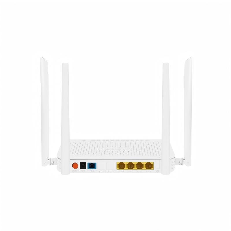 X400AX is an inteligent routing passive optical network terminal in FTTH solution. X400AX provides 4 GE LAN porport and AX3000 WiFi, high access speed up 2.5Gbps downstream and 1.25Gbps upstream. lt is widely compatible with the globa mainstream OLT brand, supports plug-and-play, OMCl and TR069 remote maintenance features.