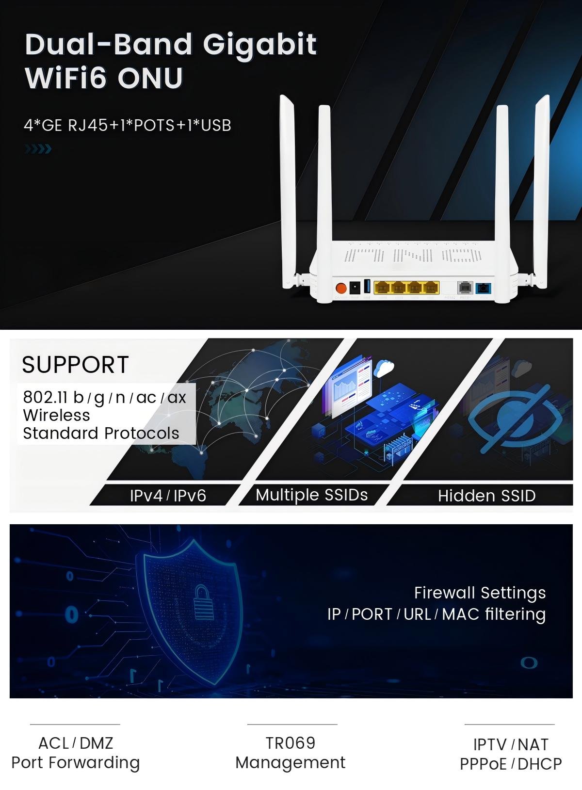 X411AX is an intelligent routing passive optical network terminal in FTTH solution. X411AX provides 4 GE LAN port, 1 POTS, 1 USBport and AX3000 WiFi, high access speed up 2.5Gbps downstream and 1.25Gbps upstream. lt is widely compatible with the globamainstream OLT brand, supports plug-and-play, OMCl and TR069 remote maintenance features.