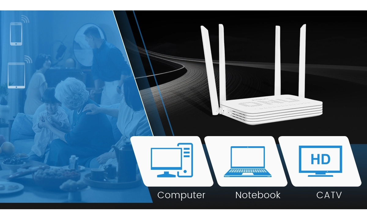 X411AX combines the advantages of WiFi6 technology and fiber-optic communication to meet the needs of fixed network operators for FTTH and triple-play services, provide multi-functional services based on E/GPON networks, and provide users with high-speed, stable and reliable network connections.